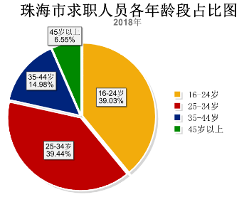 16-24岁求职者占比39.03%,25-34岁占比39.44%,35-44岁和45岁以上分别占比14.98%和6.55%。整体求职者更趋向年轻化。